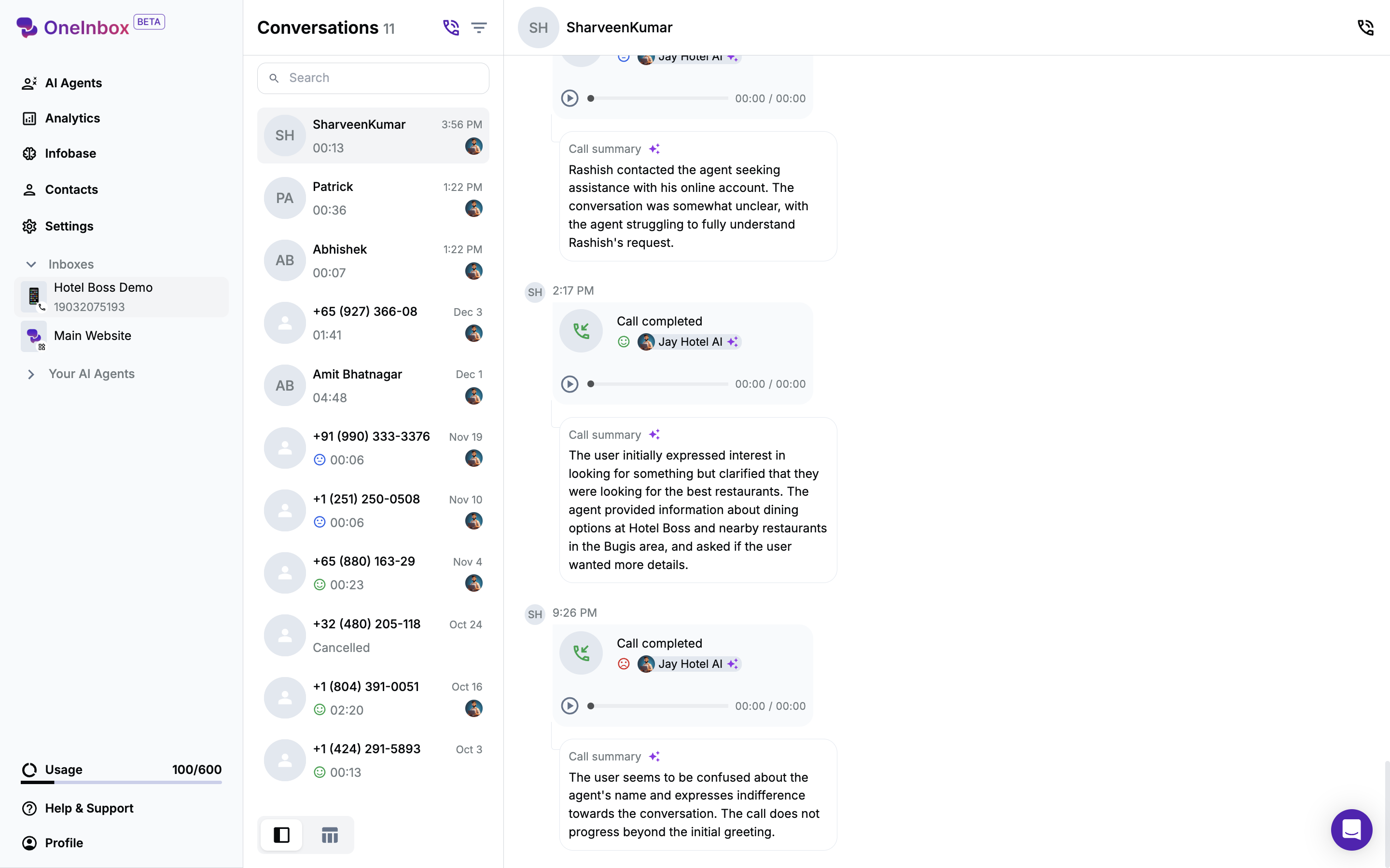 For each call in the conversation, you can:- Check a brief summary