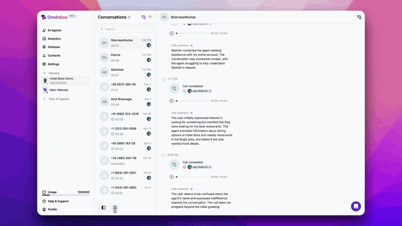 In Conversation View, you see your call logs presented in a chat-like format. Rather than displaying each call as an isolated entry, the system groups conversations by contact. This means if you select a particular contact from the list on the left, you will see all past conversations (calls) with that contact in a single, scrollable screen. As you scroll up, older conversation entries load, providing a comprehensive historical view.What You Can Do in Conversation View